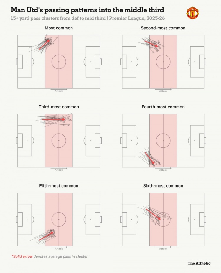 这个“底子”,在曼联后场出球时最明显。边翼卫拉开宽度,球从后场到中场一路都有接应点。曼联从后场发起进攻的六条最常见传球线路,有五条是走边路的,足见边路在他们体系里的分量。