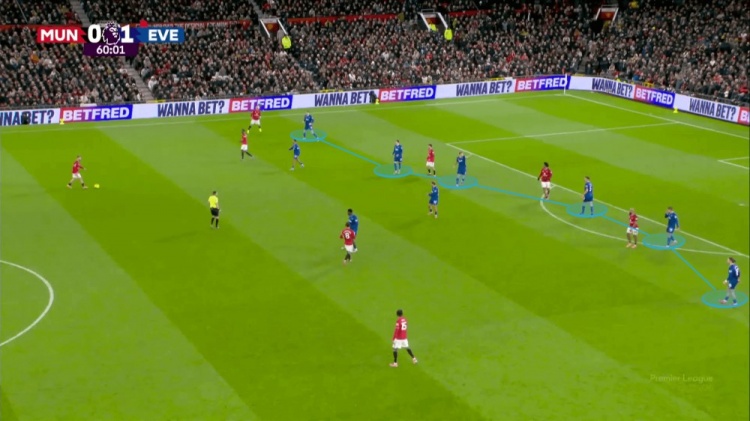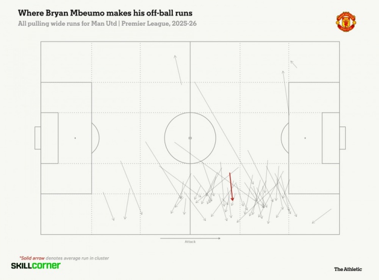 按SkillCorner的定义,“拉边跑动”指的是从中路或肋部启动,最终跑到边路通道,且比持球人位置更靠外的移动。照这标准,姆伯莫这赛季53次排全队第一,阿马德44次紧随其后。