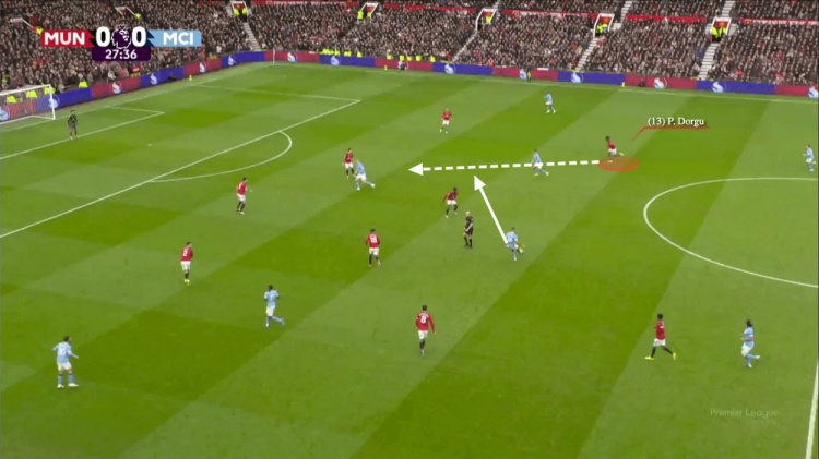卡里克就不一样,他给中卫减负了。不让他们干“前跳”这种高风险活儿了。踢曼城时,曼联是靠锋线球员回追来补位。看下面这球,罗德里找到防线间的福登,但多尔古从左中场一路狂飙回防,把漏洞堵上了。