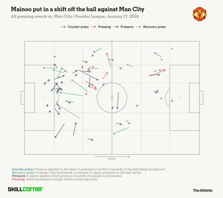 这套“梅努上顶,卡塞米罗横移保护”的动态防守,既限制了罗德里,又没漏身后。之前总被阿莫林批评无球跑动的梅努,这场覆盖范围极大,下图是他的逼抢热点。
