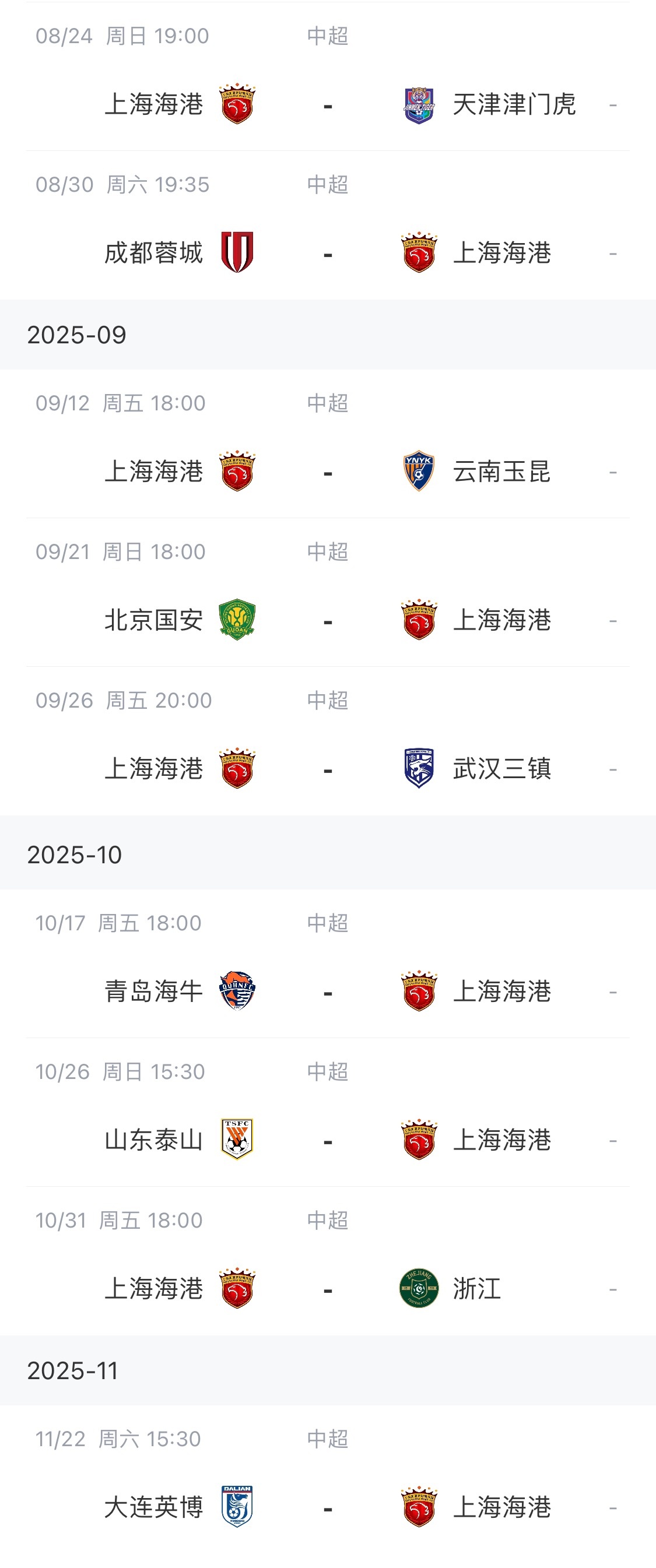 在中超还剩9轮的情况下,上海海港还需客战成都蓉城、北京国安、山东泰山和大连英博。